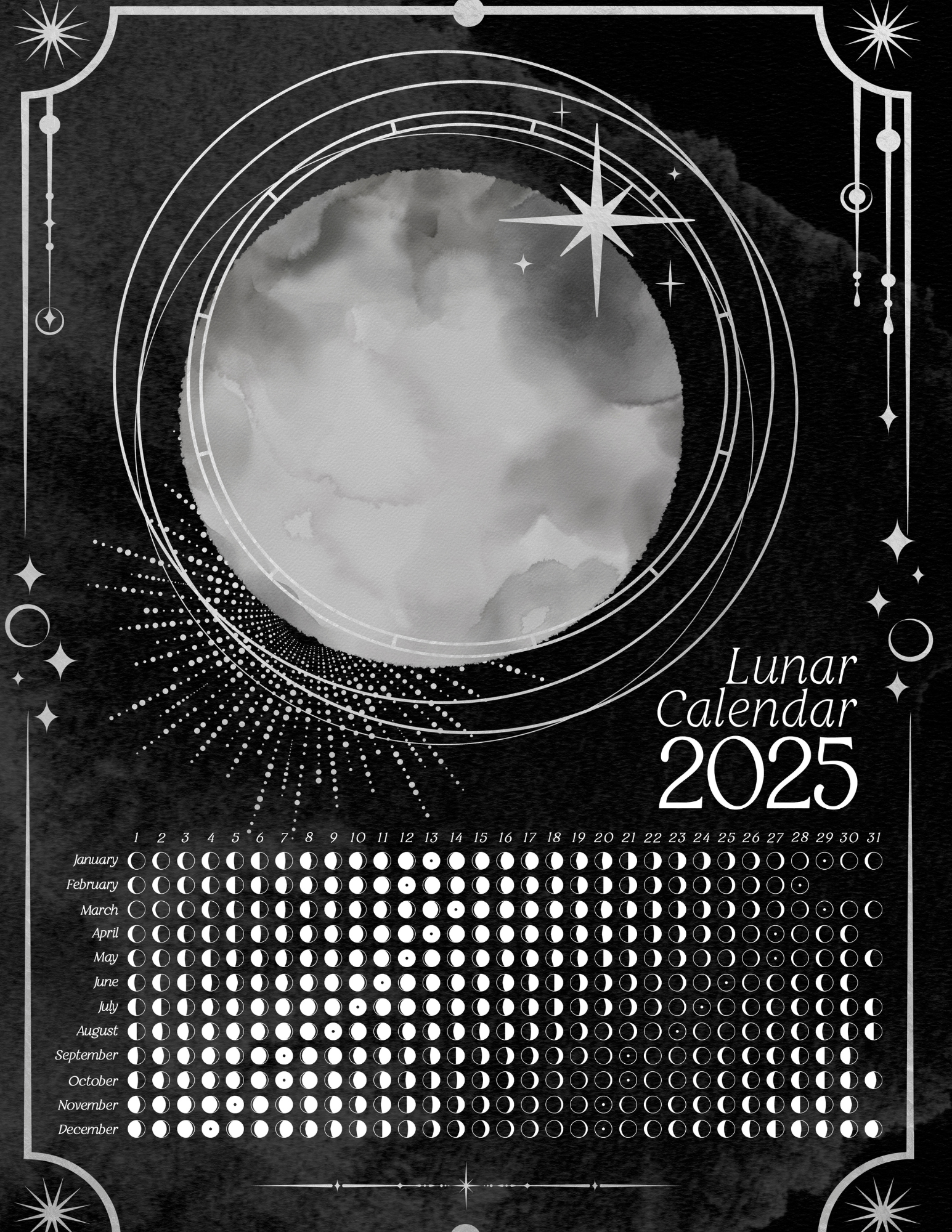 Whether you’re setting intentions, planning rituals, or just appreciating the moon’s beauty, the Dark Lunar Calendar 2025 is perfect.